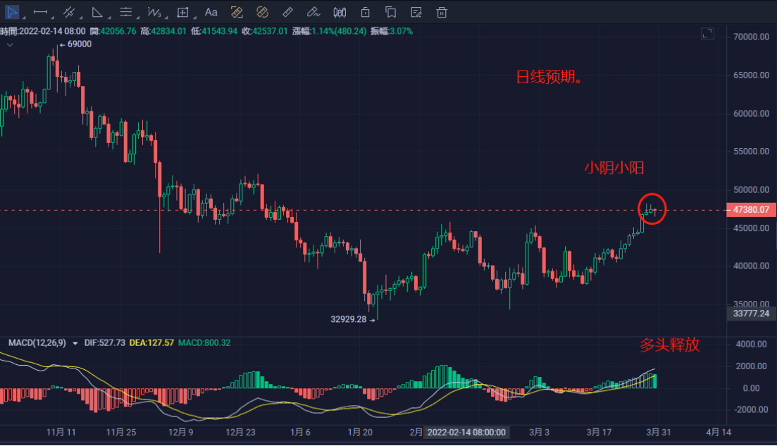 今日解析:大饼45000美金的反弹,月线季度线收线时间点,大小周期能量同步短期出现矛盾,目前的价格47500美金一线,但是一季度二季度的过渡45000美金就成了攻守决战的关键。除大饼作为市场整体晴雨表外,还有热点轮动辅助,这些组成了反弹调整,回落调整,对市场走势起到了相应稳定的作用。大饼反弹发力,很多调整,大饼调整很多带头反弹。二季度依旧多注意,LUNA,KNC等,元宇宙目前的调整还没有结束,等4月份的机会。