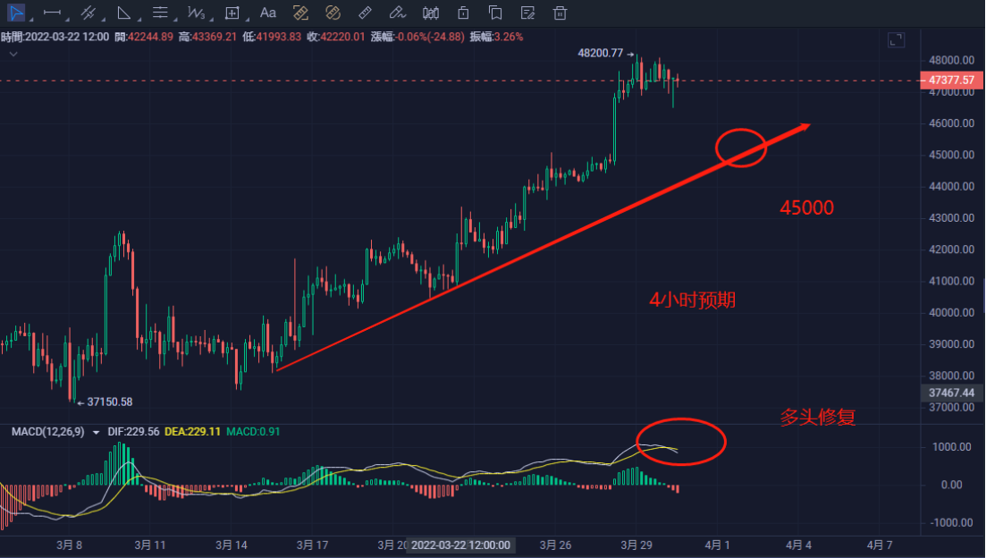 目前只说4小时图上的客观事实,震荡上行加速,多头能量修复。这就意味着,多头加速后要调整,多头能量也要修复,预期下次金叉后继续推动反弹。还有就是位置,45000美金此前是压力,现在是支撑,也是震荡上行的支撑。关注小周期看调整细节,结合位置继续保持低多。