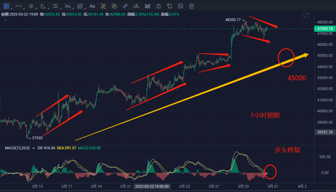 在1小时的走势中,大饼的震荡上行节奏,不断加速修复再加速,目前破位45000美金试探48000美金后开始小回落调整,多头能量也在修复,46500美金小支撑下破,日内有机会试探45000美金一线,但是多头反弹还是不变,具体交易可以继续保持低位做多。
