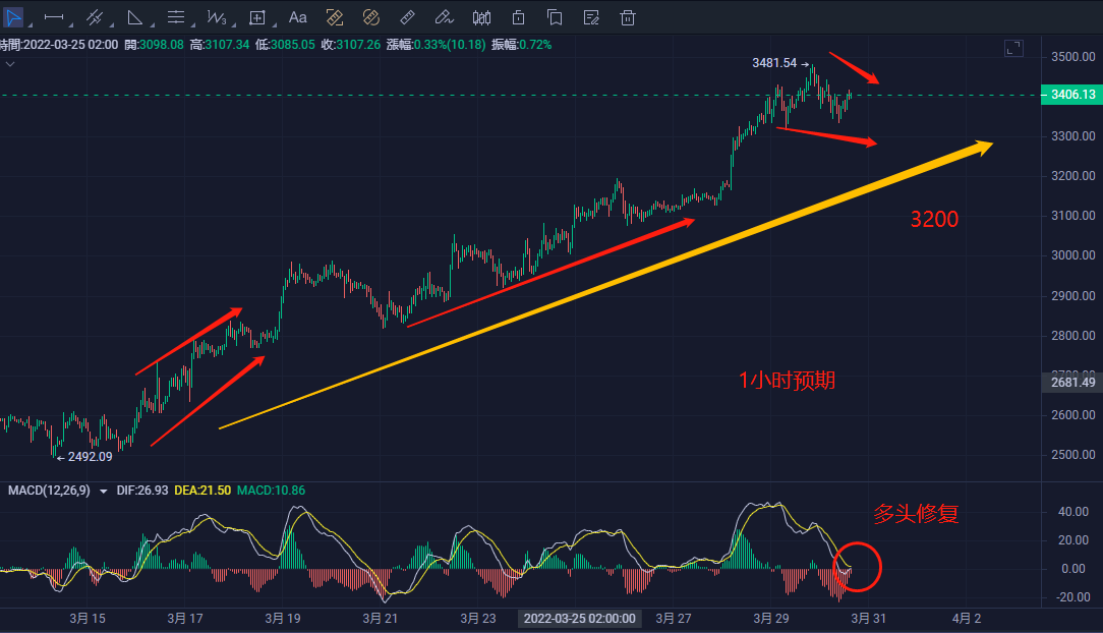 以太小周期破位3000美金企稳后,先看3300美金再就是3500美金,目前面临的短期调整,多头能量的修复也是在这里完成。注意3200--3500美金的调整,短线守住支撑继续低多为主,支撑不变多头交易不变。注意看细节。