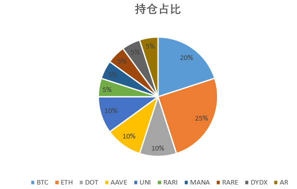 去年7月20做的实盘,主要持仓集中在BTC\ETH\DOT、DeFi蓝筹以及元宇宙NFT上,并且到今年3月之前都没做多少变动(因为已经接近满仓了),只是在DYDX暴跌后加仓了5%,利润略有回吐,从最高的200%回撤到了47%。