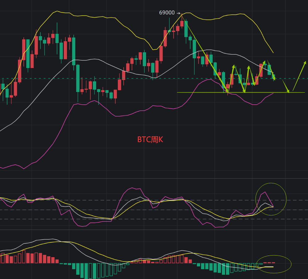 比特币日线连续3天持续承压40800下方,行情近两天持续在40000--40800区间震荡,行情波动较小,日线行情站上MA7均线上方,周K承压BOLL中轨一线回落,呈下插针,KDJ指标三线死叉向下,MACD指标红色实体动能柱缩量,4小时图BOLL再次缩口,行情持续处于BOLL中轨一线震荡,KDJ指标运行在50轴一线钝化,MACD指标双线运行至0轴一线,小心水面死叉向下,综合来看,周六周末行情持续小幅震荡,4月18日凌晨关注上方40800一线压力,破位关注41600-41800区间压力,下方关注39600--39200区间支撑,日线和周K大级别指标目前均为空头趋势,但行情持续震荡,小心行情周K收线行情反转反弹上行,建议低多为主