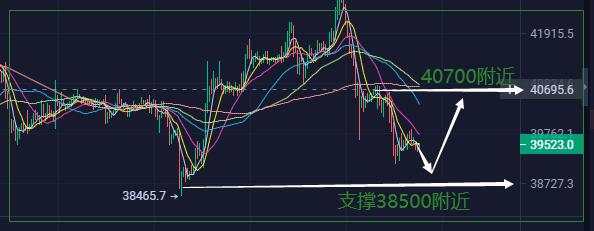 由于受加息影响上涨受压,日线技术分析BTC在相对低位横盘10日,行情有下跌受阻迹象,日线行情无下跌形态结构,1小时线分析,K线穿插在120MA 忙均线中,说明行情也是横盘,近期采用震荡思路操作,支撑在38500附近,日内压力在40700附近,在支撑附近用绝地反击战法开仓!轻仓操作,低杠杆操作,建议参考!