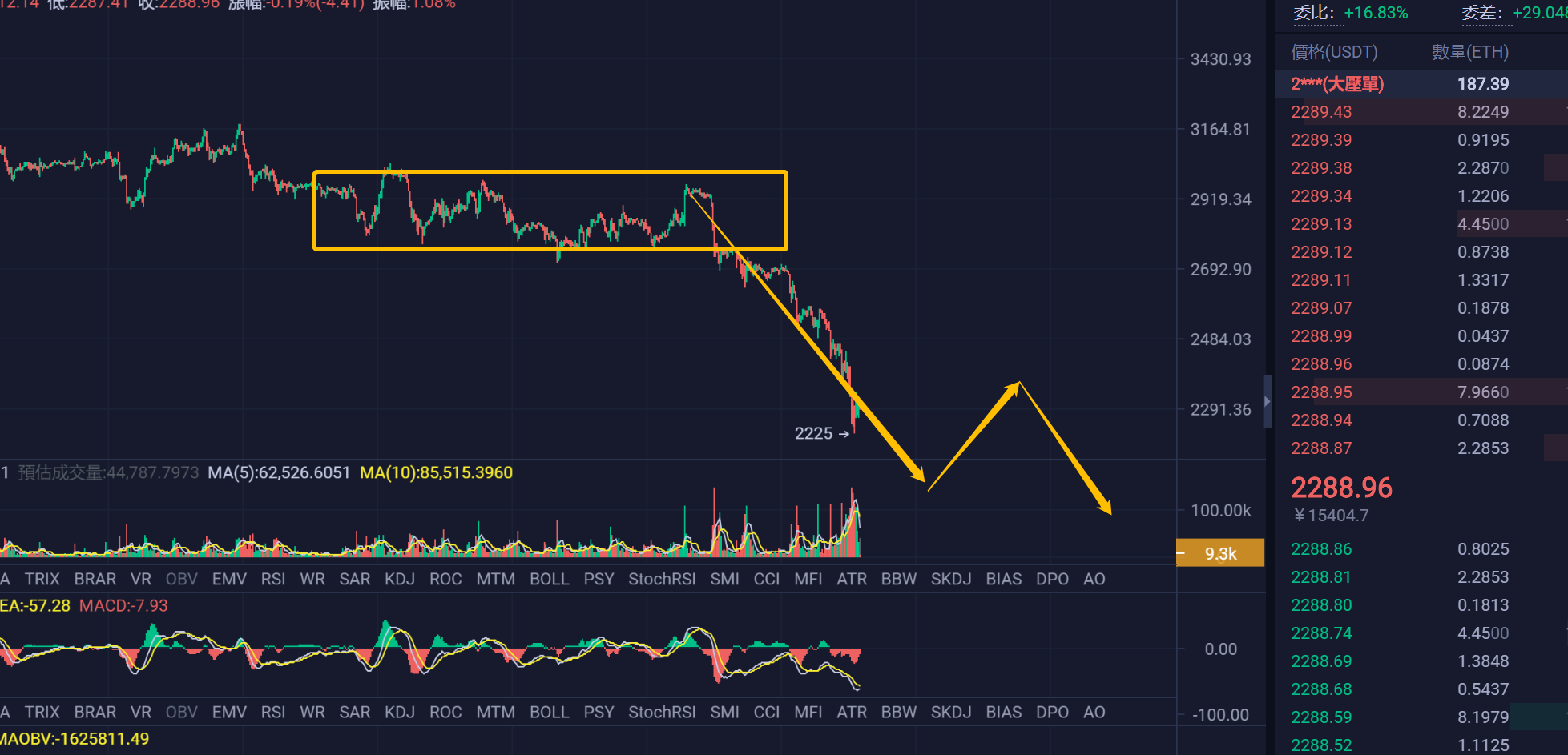 大饼1H的结构,大饼的1H的三卖并没有出来,反而因为UST的事情和影响暴雷,出现暴跌的情况,8W个大饼要等着被清算,所以对于主力而言还是心有余悸,都很多在抢跑,目前还是这笔离开笔的1H的下跌整体的结构是不背驰的,后续就算反弹也将要继续下跌,估计能看到2开头的大饼了。29000-3W附近是比较强的支撑,也是去年7月份的支撑,看大饼是否能够在这个区域形成一个小局部的反弹,但是也仅仅只是小反弹后面大概率也会跌的,熊途路漫漫。
