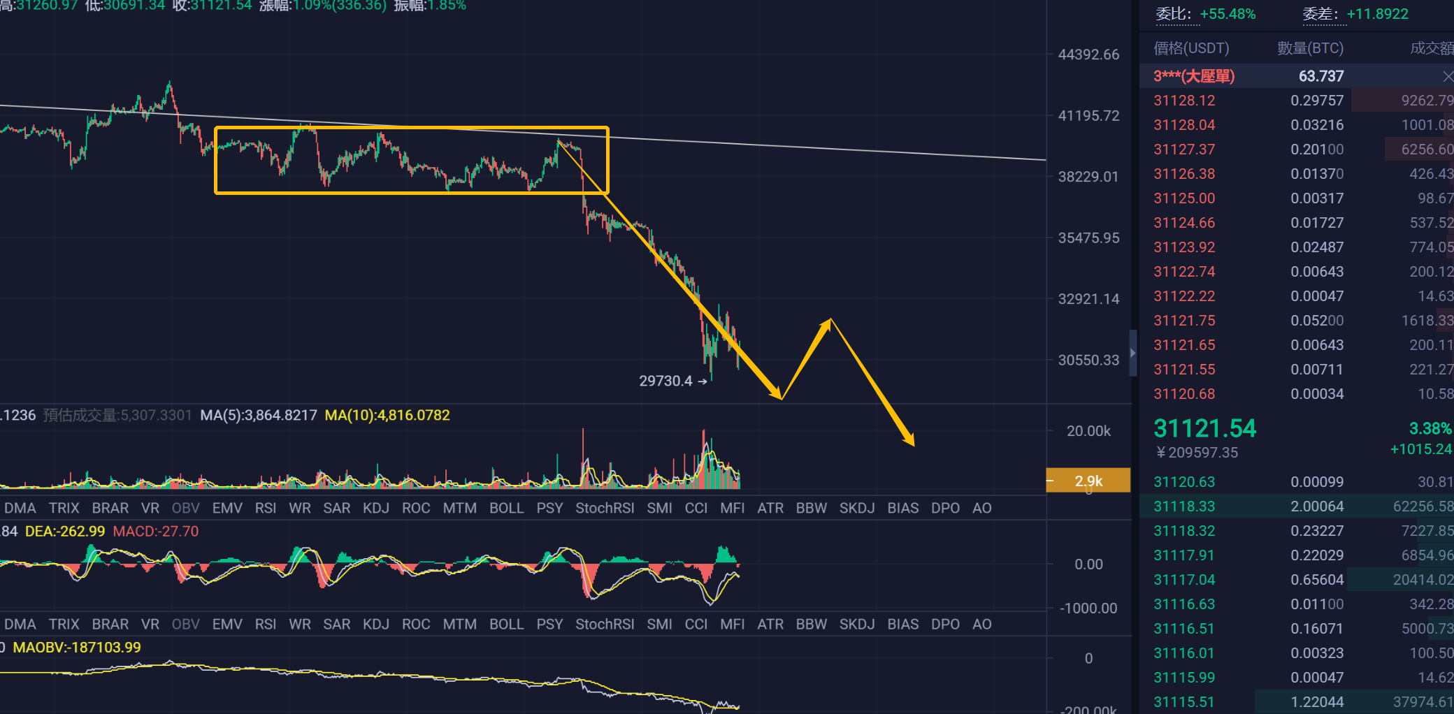 大饼15F的结构,大饼目前是有概率这里构建一个15F的中枢,今天早上的下跌并没有跌破3W的位置,看是否能够在一次去摸一摸32600.或者有可能会走一个收敛三角。个人觉得走收敛三角的概率比较大,因为往常大饼大跌之后都是走收敛三角,然后收敛到极致之后又走成长方形的震荡走势。总归就是震荡为主。