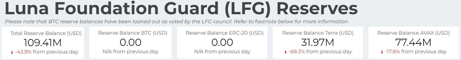 — Santiment (@santimentfeed) May 11, 2022The embattled cryptocurrency is now down a staggering 96.49% from its all-time high of $119 reached on April 5. Due to the immense collapse, Terra now ranks 37th largest in market value, coming down from the seventh position it had usually held. Terra's UST is trading at $0.497, failing to restore its peg to the $1 mark. Luna Foundation Guard has deployed all of its Bitcoin reserves to bolster the algorithmic stablecoin, confirmed by a peek into the Luna Foundation Guard reserves dashboard.