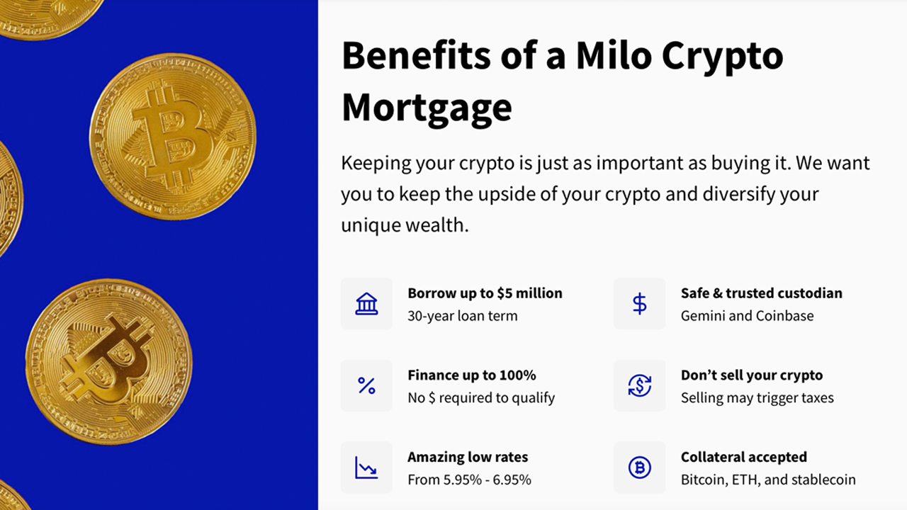 Milo offers crypto-backed mortgages and accepts BTC, ETH, and a few stablecoins.