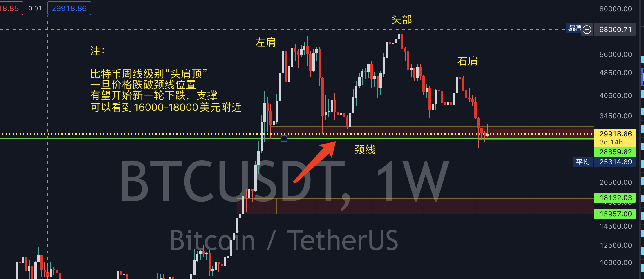 从技术上来看,比特币在大级别周线上正在构建一个“头肩顶”的看跌结构(如下图),目前已经完成了右肩结构,一旦价格有效跌破颈线,比特币将迎来主跌浪,跌破的K线有望成为周线主跌浪的启动K线。因此,梵高认为未来的1~2月里面,加密市场将迎来真正的下跌考验,强烈看空整个市场,这里建议大家守住本金,如果你不做空,那就多休息。