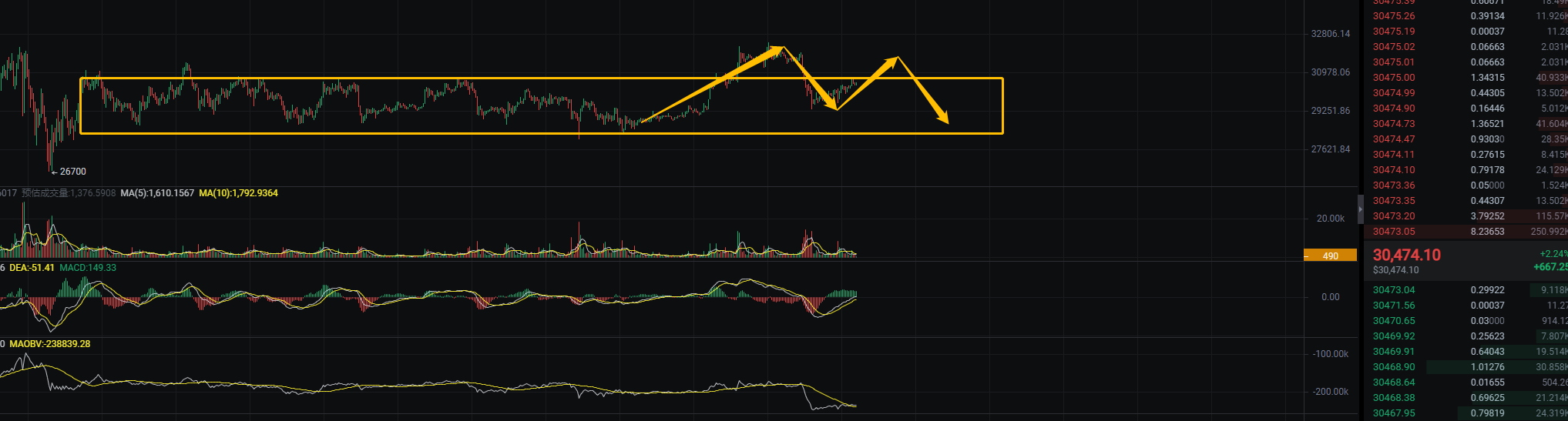 大饼1H的结构走势,大饼目前1H的结构依然还是按照昨天的走势继续运行的,昨天也通常说了画门之后的走势通常都是不会跌破大阴线的收针的位置,后面就是震荡然后继续向上,昨天虽然经过短暂的下跌主要还是昨天老美发布就业的情况导致,但是后面还是拉回去了了,这里依然是看反弹,但是这笔反弹大概是过不了3.2W无非就是跟前面齐平然后继续下跌到在中枢之中继续在震荡,或者突破中枢在走三买才会有机会,否则依然还是看空的走势。