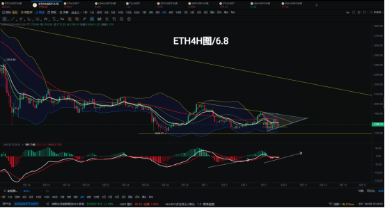 ETH4小时技术走势;目前出现对称三角整理形态常规理解为价格突破上下边界即可顺势跟随;但结合价格结构技术指标方面来看在上下均有可能的情况;倾向于短期市场将选择向上突破的机率会大一些;所以建议多头突破可跟随空头破位尽量保持观望先!