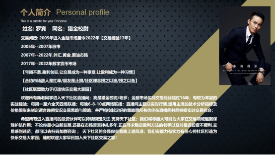 欢迎所有新老同学进入天下社区实况指导直播间;我是猎金校尉/老罗;金融市场实战交易经验超过16年;有较为丰富的实战经验;每周一至六四场联播;每晚6-8-10点两场联播;直播间主题以实时行情.运用主流的技术分析指标及价格图形来制定适合晚间实况交易思路与策略;并严格按制定好的策略同所有伙伴在直播间共同捕捉实时交易机会;