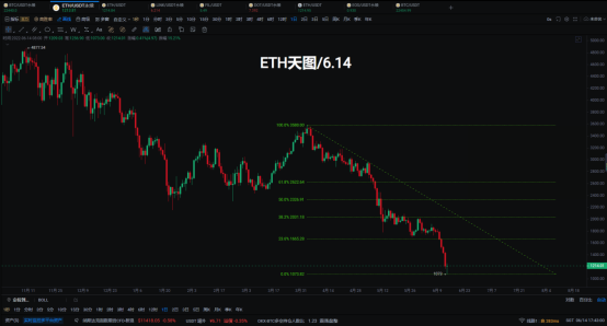 ETH天图技术走势;昨开1434/高1454/低1162/收1209/跌幅15.71%收跌225美元/振幅20.40%【日K收大阴线中期趋势空.日内方向震荡.多空暂不明】技术走势面经过四连阴大幅下跌后;日内最低价格触及1075暂有止跌迹象;市场有存在加速探底动作的嫌疑;但还未明确价格已经进入超跌区域;可以保持高空思路但切记不可追空!