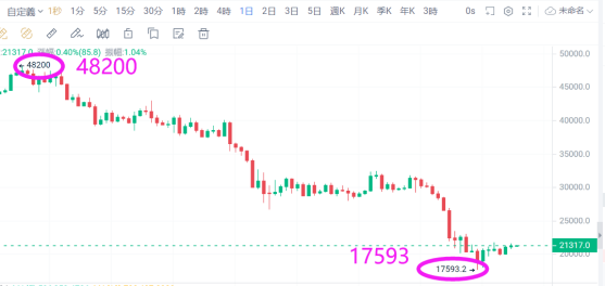 1、日线:BTC48200开始持续下跌,截至目前最低17593。