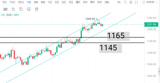 总结:1小时图昨日如分析一致调整在1125-1105以上继续拉升,目前运行在上升通道当中,关注通道内的运行方式,破位下轨则有调整出现;支撑1165-1145。