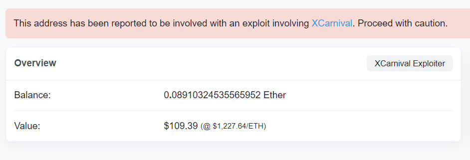 XCarnival黑客的ETH钱包余额  来源:etherscan.io