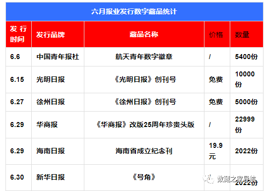 据统计,目前已有数十家传统报业已经发行或正准备发行相关数字藏品,其中包括新华社、人民日报、光明日报、华商报、中青报、海南日报、河南日报、徐州日报、大众日报、金融日报、上海证券报、深圳特区报、深圳晶报……仅六月底,就有新华日报、海南日报、徐州日报、金融日报四家报业扎堆发行数字藏品。