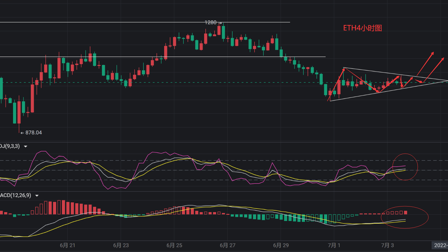 以太坊7月2日日线收线呈阳柱,日线继续承压BOLL中轨下方,MACD指标红色实体动能柱缩量减量,但行情下跌幅度未扩大,行情持续稳定在1020上方,短线4小时BOLL收口,行情进入三角型震荡收敛阶段,行情连续上下插针,当前K线站稳BOLL中轨上方,MACD指标红色空心动能柱放量增量,短线行情有继续上行的迹象,关注上方1080--1100一线压力,小时图三角型震荡收敛进入未期,BOLL收宅口,KDJ指标在43轴金叉向上,行情回撤底部在不断抬高,综合来看:行情短线有反弹向上的迹象,但目前三角型震荡收敛未完成,方向并不明确,空头迟迟不能突破下方1020---1000支撑,建议还是以低多为主
