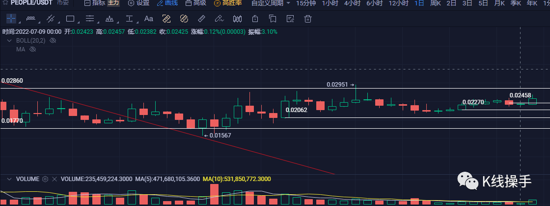 PEOPLE今天走的还是很强势的,希望24点收盘能收在0.0256的上方。PEOPLE今天的日线,四小时周期,一小时周期都出现了买点,可惜昨晚的多单因为跌破了位,今早成本走了,后面又追了回来,目前持有多单中。如果BTC明天能反包,预计还会有新高。继续持有中。不建议追了!