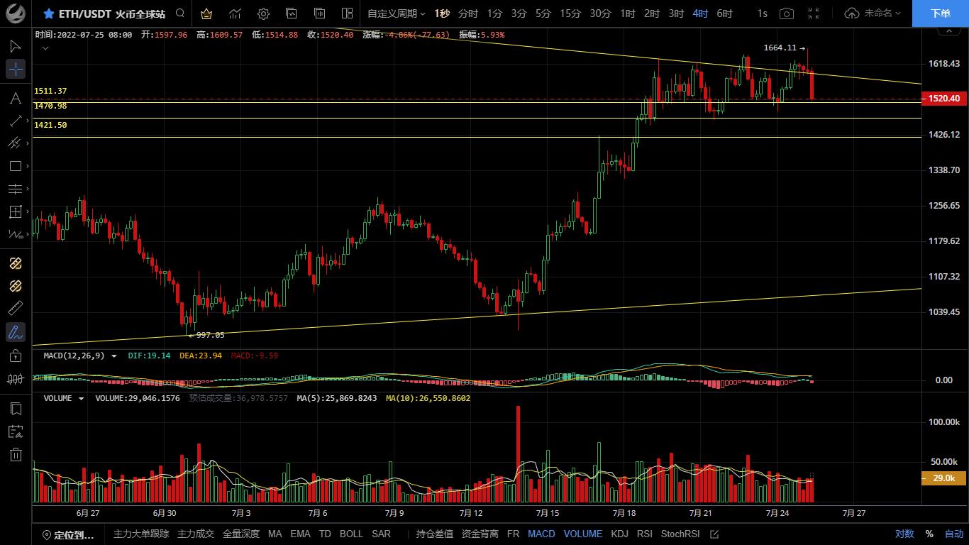 以太坊昨日走势较强,行情较为反复,且震荡幅度逐渐变窄,直到早间多头发力向上拉伸至1665一线承压回落,目前币价在1540附近运行,四小时级别收长上影阴k,随后连阴下行,多头未能走出延续,macd多头转空双线死叉,kdj死叉向下运行,布林带三线走平k线跌破中轨,整体来看空头占优,反弹会有但预计不会有太大空间,目标还是看1430-1380不变,思路依旧逢高做空,上方压力1555-1575,下方支撑1460-1430