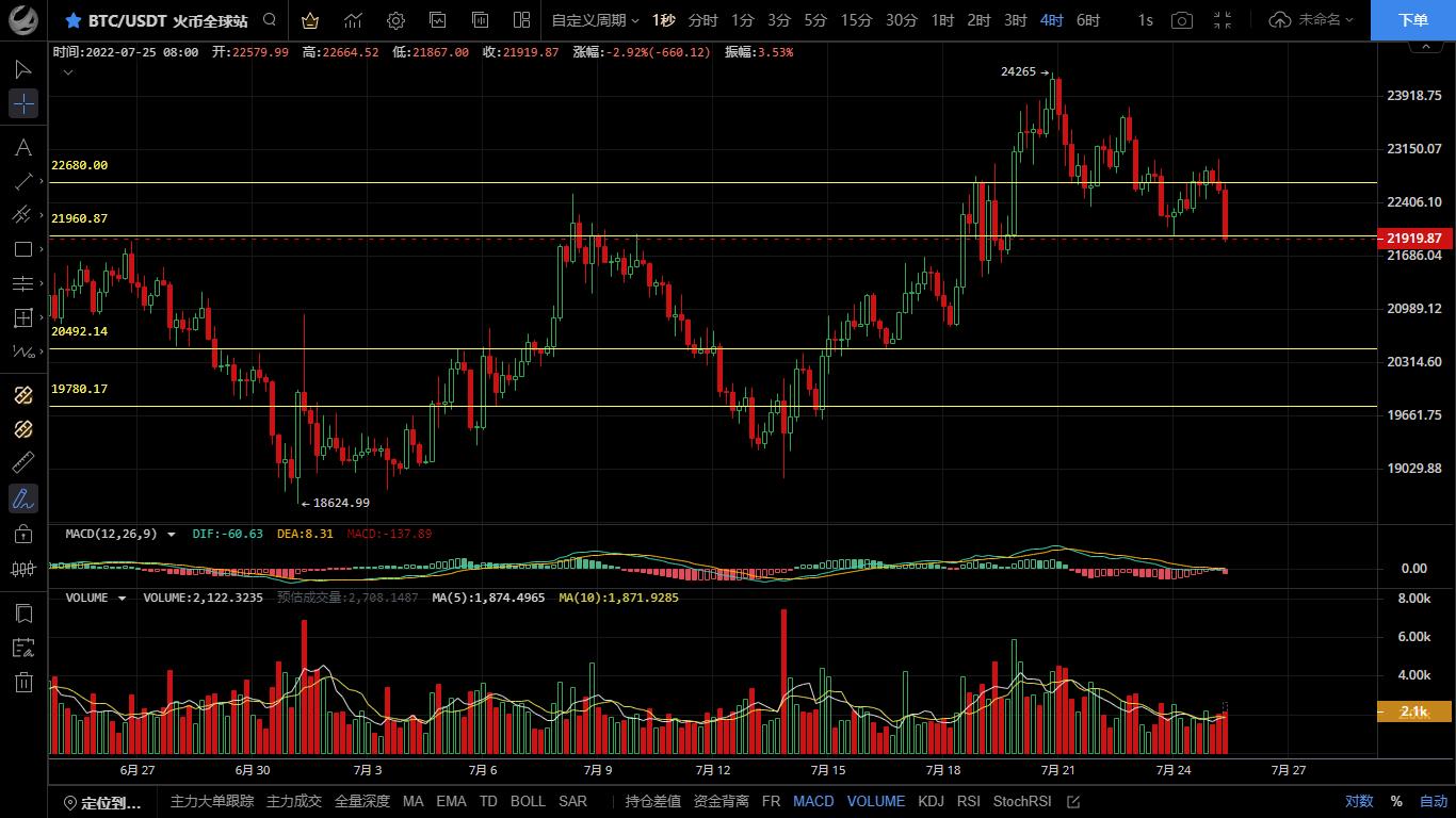 大饼昨日午间走出一波反弹后陷入小幅震荡,早间多头拉升高位触及23000一线后承压迅速回落,恭喜跟上昨日思路的朋友空单获利800点,目前币价在22200一线运行,四小时级别行情走势较为明显,呈震荡下行趋势,形成短期的下行通道,反弹高点再逐步降低,k线连阴 macd延续空头走势双线死叉,kdj三线死叉向下运行,同时均线也向下拐头形成共振,思路上依旧看空不变,上方压力22600-23000,下方支撑21500-21000