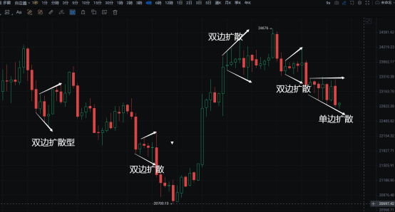 4小时出现了一个阴线后扩散三角,这种走势,不好判断玩法,但通常没啥好结果,标准形态和变形如下: