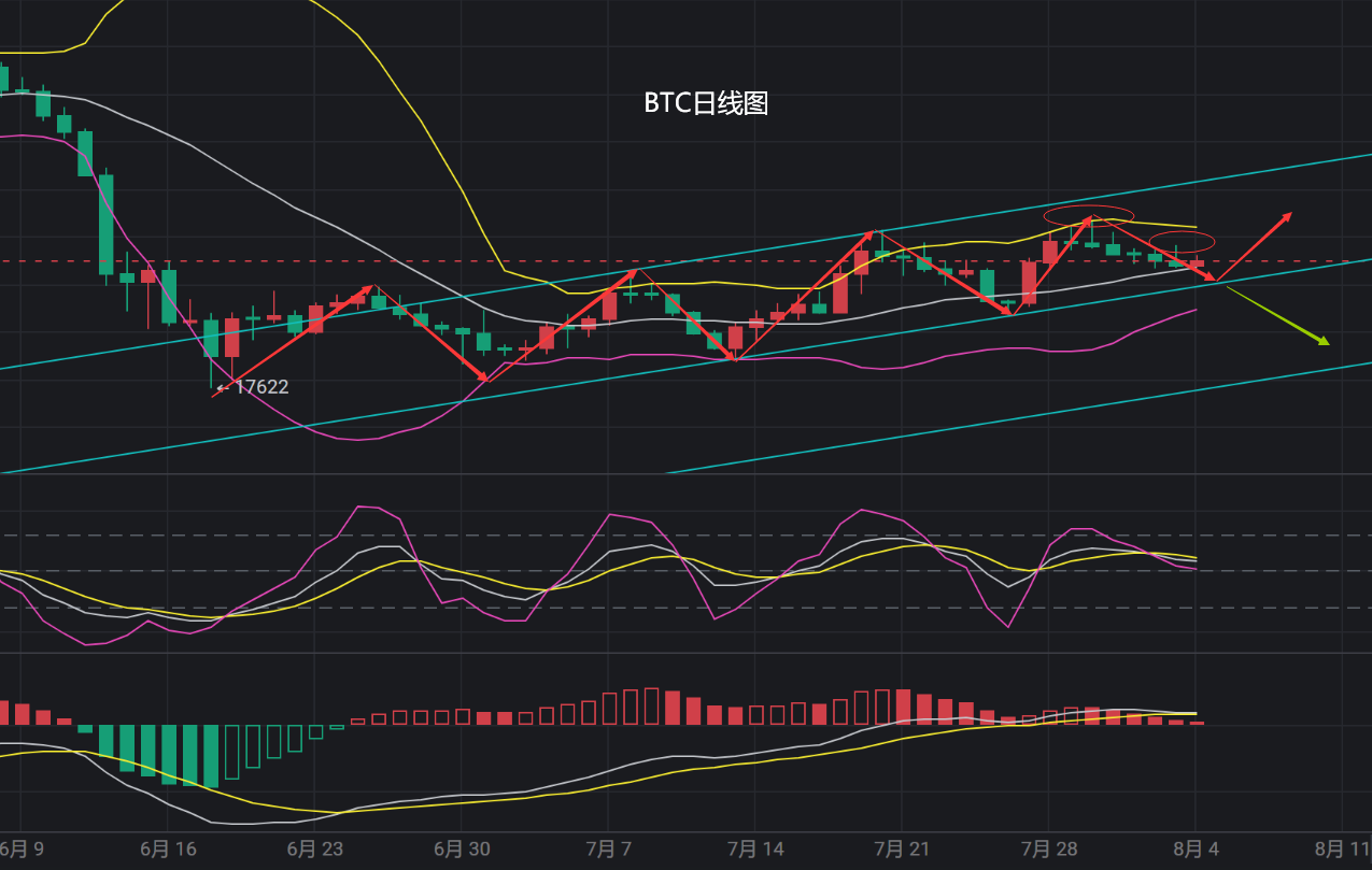 BTC本周行情持续处于低位震荡,行情上方承压23800--23600区间,下方强支撑22600一线,日线8月3日K线收上插针倒垂阴K,8月4日K线收线即上行,行情触及MA7均线回落,当前呈上插针阳柱,KDJ指标三线死叉向下运行,MACD指标红色实体动能柱连续缩量减量,日线BOLL中轨一线支撑目前来看还是比较强的,日线关注上方23600--23800区间压力,下方22600一线支撑,短线4小时行情BOLL收口,KDJ指标在50轴死叉,MACD指标多空动能放量不明显,主图K线短线承压BOLL中轨附近,短线行情破位22600一线后关注22000整数支撑,综合来看:目前行情持续处于窄幅震荡,日线行情白盘上涨晚盘回落,并且国际局势更加紧张,老美直接插手俄乌地缘问题愈发严重,进场以短线为主,切勿久拿,建议以高空为主,