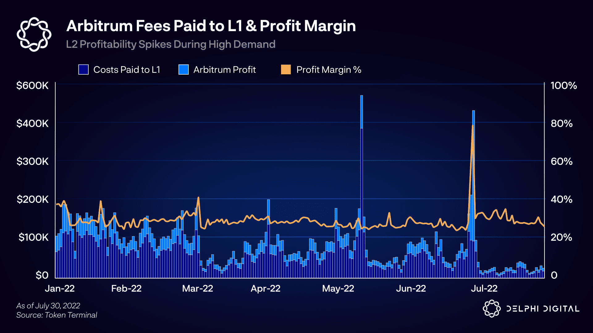 我们在 Arbitrum 最近的激增中清楚地看到了这一点,尽管其利润率在其他方面一直很稳定。Arbitrum 最近的瓶颈是 L2 执行(而不是 L1 成本),因此其本地收费市场开始启动:
