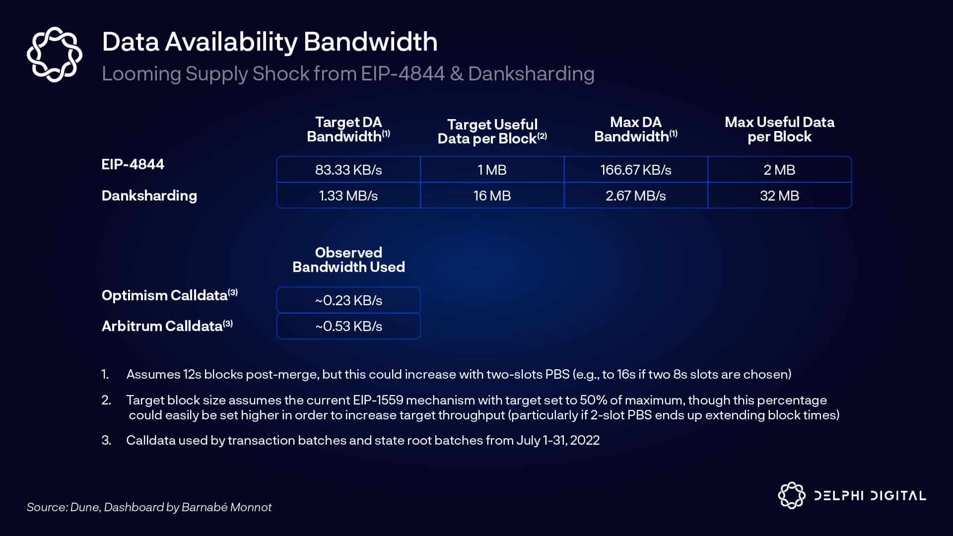 Rollup 应该愿意为优质 DA 支付什么,这是一个有趣的争论。然而,现实情况是,DA 很快就会在以太坊扩展和替代 DA 解决方案之间大规模地供过于求。关于数据可用性的规模,可参见下图: