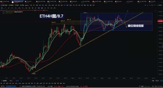 ETH4小时技术走势;结合昨8.6图分析预期的四小时级别W双底结构思路暂保持不变;价格在昨日受阻1750一线后展开震荡回落行情正在测试较为重要的颈线位1680-1660,及上升趋势线有着多重支撑作用【颈线位.50MA.趋势线.】虽然有破位的机率但空头破位难度较大所以空头观望,若真当出现空头破位W双底失效短期将再度转为1780-1560上下220美元区间箱体震荡;至16点若4小时能够在颈线位附近收一根明确的看涨信号;双底结构依然有效!