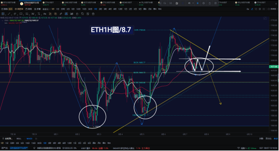 8/7/天下社区:以太4H测试1680颈线;1H跟踪筑底结构...