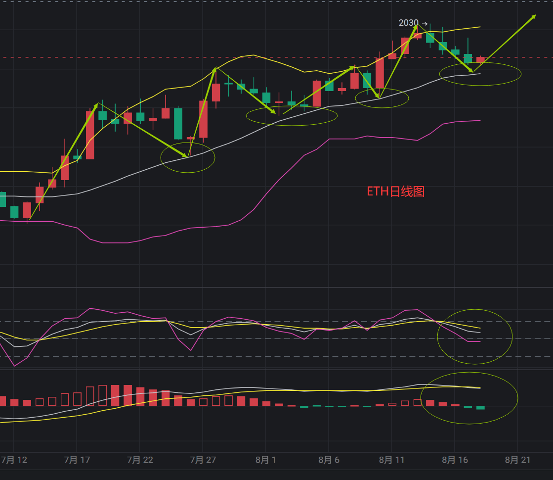 以太坊行情在日内继续稳定在1800上方,行情两次1820附近反弹,短线目前还是处于窄幅震荡,日线行情在昨日跌破BBI均线支撑后,行情在今日再次上上BBI均线,日线目前还是处于BOLL中轨上方,震荡上行趋势线目前完好,短线4小时行情BOLL收口,行情承压BOLL中轨下方,KDJ指标三线在20轴金叉向上,MACD指标绿色空心动能柱缩量减量,短线 4小时目前有反弹上行的迹象,晚间关注BOLL中轨压力,破位行情有继续上行的动能,综合来看:周K在本周回撤未跌破BBI均线支撑,日线行情在 BOLL中轨上方止跌,继续延续前段时间中轨附近的强支撑,短线目前在晚间有继续反弹的迹象,建议还是以低多为主,具体策略建议会在公众号给出,扫描下方二维码免费获取