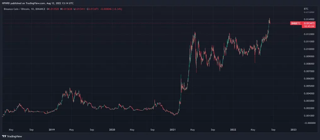 这就是时间的复利价值,然而加密货币似乎根本没有从这种动态中获益,而且受到了相反的影响。由于几乎所有加密项目的支出都超过收入,因此它们必须通过增发货币产生资金来弥补其负净收入。因此,除非收益增长或其倍数扩大,否则每个代币的价格都会下降。最值得注意的是 BNB,它是目前唯一一个收入超过支出的 L1 代币。下图可见,BNB/BTC 大多数情况下处于上涨趋势且在最近突破了上一个最高点。