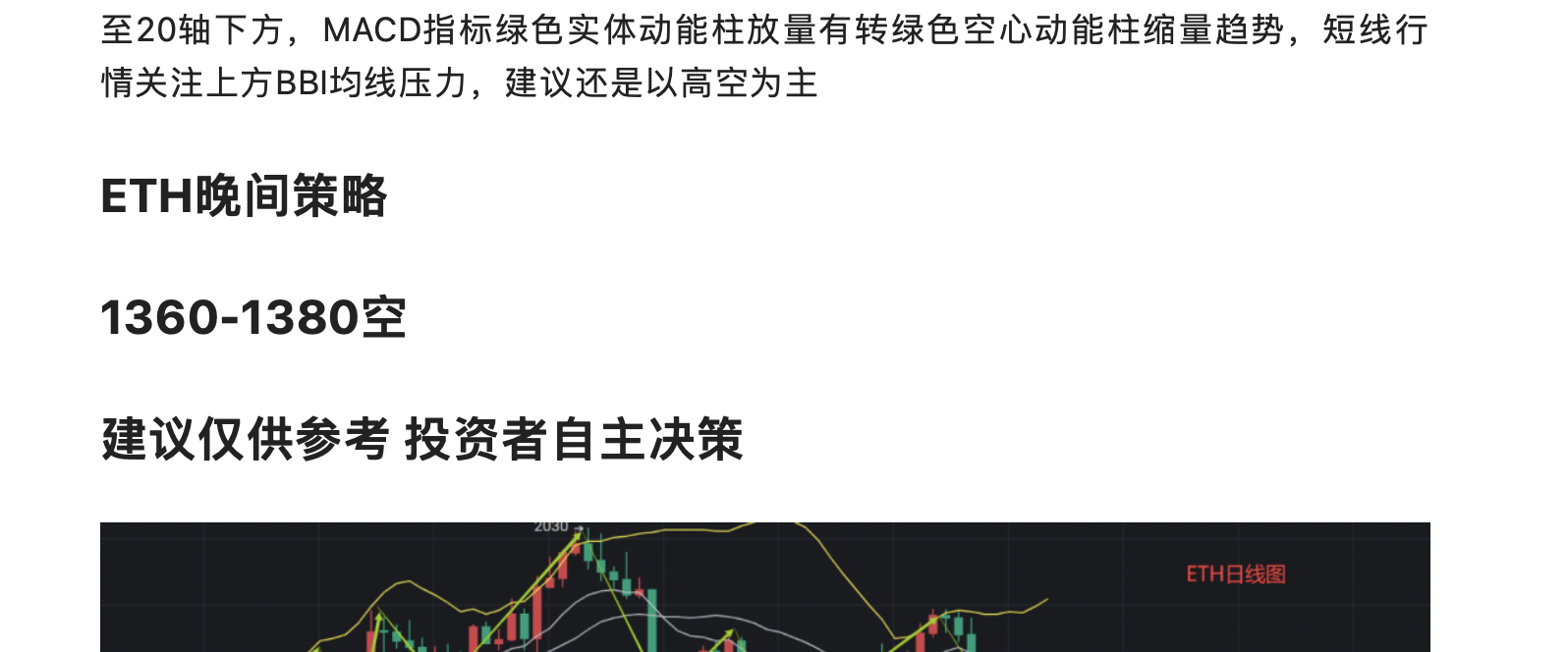 ETH短线4小时行情在触及1270一线后在昨日晚间小幅反弹,行情在日内触及BOLL中轨一线后承压回落,KDJ指标三线当前略微出现拐头,MACD指标红色空心动能柱放量增量,短线4小时近期第三次承压BOLL中轨,行情若回落关注1270一线支撑,破位行情将继续下行,日线9月19日K线呈下插针阳K,行情反弹承压1400一线,9月20日K线当前呈阴K,BOLL呈开口,KDJ指标三线运行至20轴附近,MACD指标绿色实体动能柱放量,从日线附图指标来看,下方继续回撤空间不大,但考虑到市场大环境,美元持续走强,行情短期内大幅反弹不太可能,日线关注1400一线压力,小心行情在附近形成顶底转换,破位关注1480--1520附近压力,建议还是以高空为主,具体策略建议会在公众号给出,扫描下方二维码免费获取