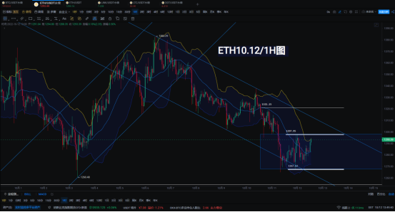 ETH4小时技术走势;4小时价格走势维持在窄幅下降通道运行;1260短期支撑作用明显;若反弹突破下降通道上轨的压制,有进一步向上反弹测试1320-1340