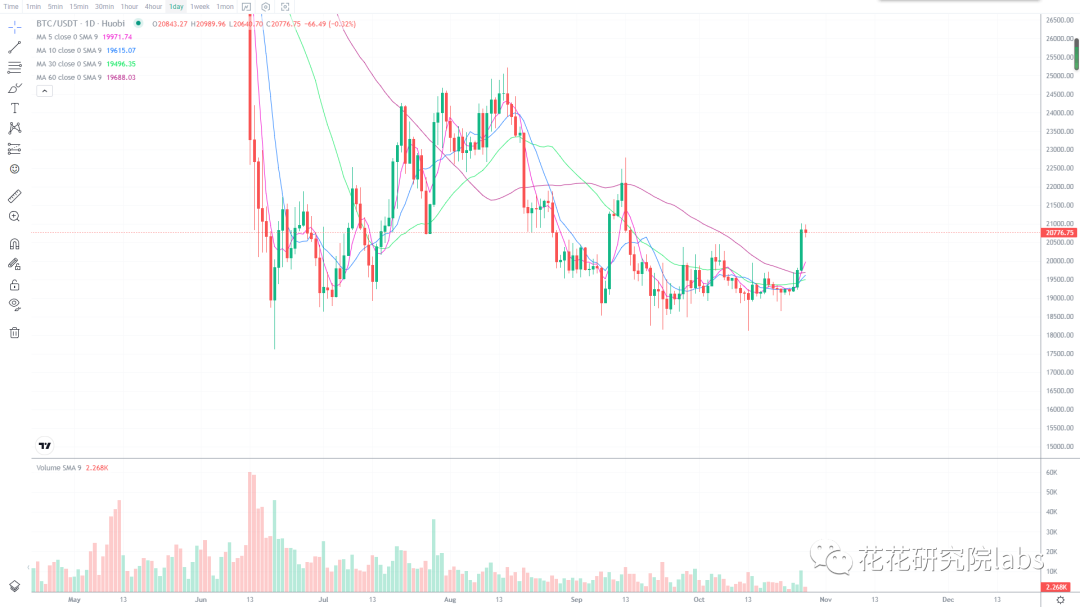 最近美股走的非常强,也带动比特币走强,比特币目前已经突破20500的平台压力位,打开上涨空间,预计后续还能反弹几天,这个位置如果比特币不直接上涨的话,就有可能会回踩到20200-20500这个区间,回踩之后继续反弹。这个位置的强势上涨,花哥认为只是反弹,不是反转,反弹之后还会再次探底。
