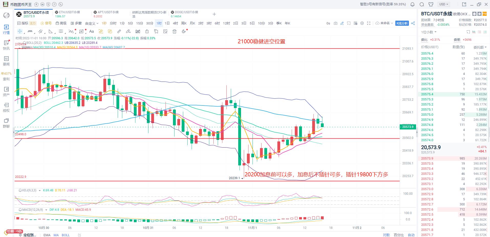 然后我们回到具体的盘面当中看一看,比特币在昨晚进行了小幅的回踩,最低是来到了20200附近,在该位置支撑反弹,如果说从周期上来讲,实际上底部已经开始出现上移了,我们知道上一波下行的低点是在20000下方一点。在日线上,昨天是收了一根小阴线,但是没有打破底部的支撑,结构上还是在上周四以来形成的区间之内进行波动。因为近期市场的消息面比较多,然后以公布的消息还是以利多为主,从我的角度来思考,我觉得11月走反弹的概率是偏大的,在加息之前事实上可能抱有一定的谨慎态度,或者是出现观望情绪,行情会维持在小区间内震荡。加息之前高抛低吸,加息之后逢低做多。思路就是在加息之前,可以在20200~21000这个范围之内进行单子的布局。加息之后如果说意外向下,插针给到19800下方,直接选择进多,如果说行情不给大的回调,那么在20200附近激进的币友,可以选择提前进场。如果说加息的消息公布的时候行情没有大的回调,那么我会觉得会有一波不错的,反弹那么多单可以作为中线持有问题不大,止损就可以适当的放大一点300~500个点,利润看1000个点以上。