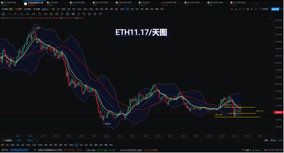 ETH天图技术走势;昨开1252/高1268/低1185/收1215/跌幅2.96%收跌37.03美元/振幅6.59%/技术走势分析:昨日日K收一根小阴线形态;三均线的10EMA-15EMA向下压制明显;技术走势偏弱但市场波动情况来看上涨无力下跌无动能;短期不破区间格局依然维持震荡思路!
