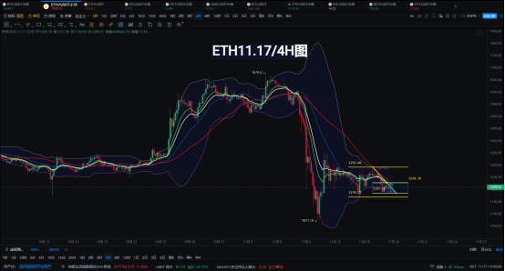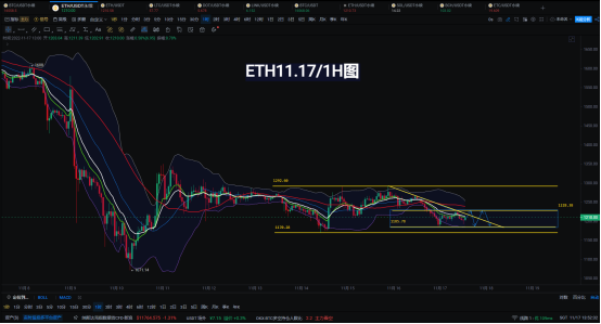 ETH1小时技术走势;小时价格走势小区间波动范围1180-1230稍大波动范围1170-1290;上破1290将有机会测试1330-1350;暂无明确的多空方向;区间内可保持高抛低吸;更多细节直播间分享交流!