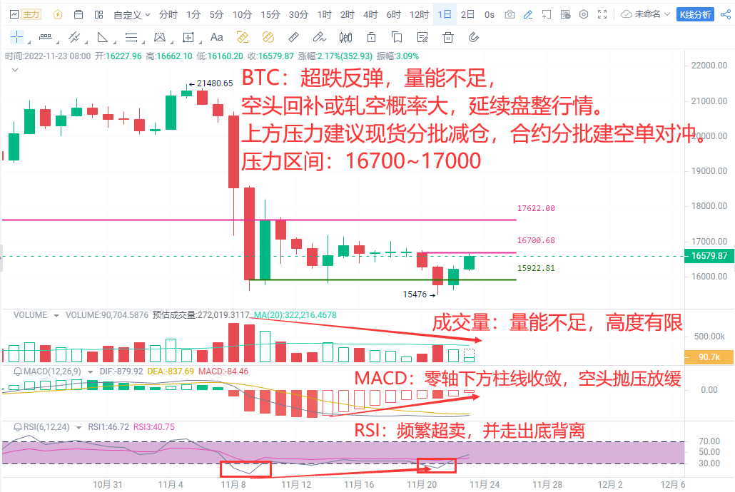 目前黑客地址仍然没有抛售完毕,FTX的资产也存在抛售偿还债权人的可能。周二的上涨,更多的是跟随美股上涨,空头回补或轧空行情,不改熊市特征。维持15500-16000是短期阶段性底部,接下来3-4周大概率延续盘整的观点。