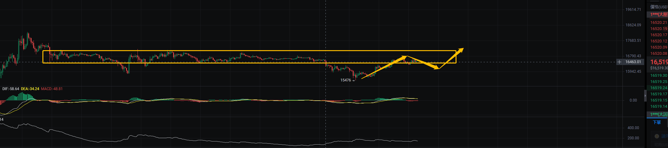 大饼1H的结构,可以看到大饼已经拉回之前的中枢之中继续震荡,不过拉回的话个人看还是表现不错,还是有机会突破这个中枢,看看是否能突破18500的位置,如果能够突破18500的位置的话,那么就为后面的大反弹奠定了很好的基础,当然就算不能拉回18500,能去17500-18000这个区间的话也能为下一次的反攻做一个基础的准备。个人依然还是看好未来市场。机会总是在怀疑中来临。