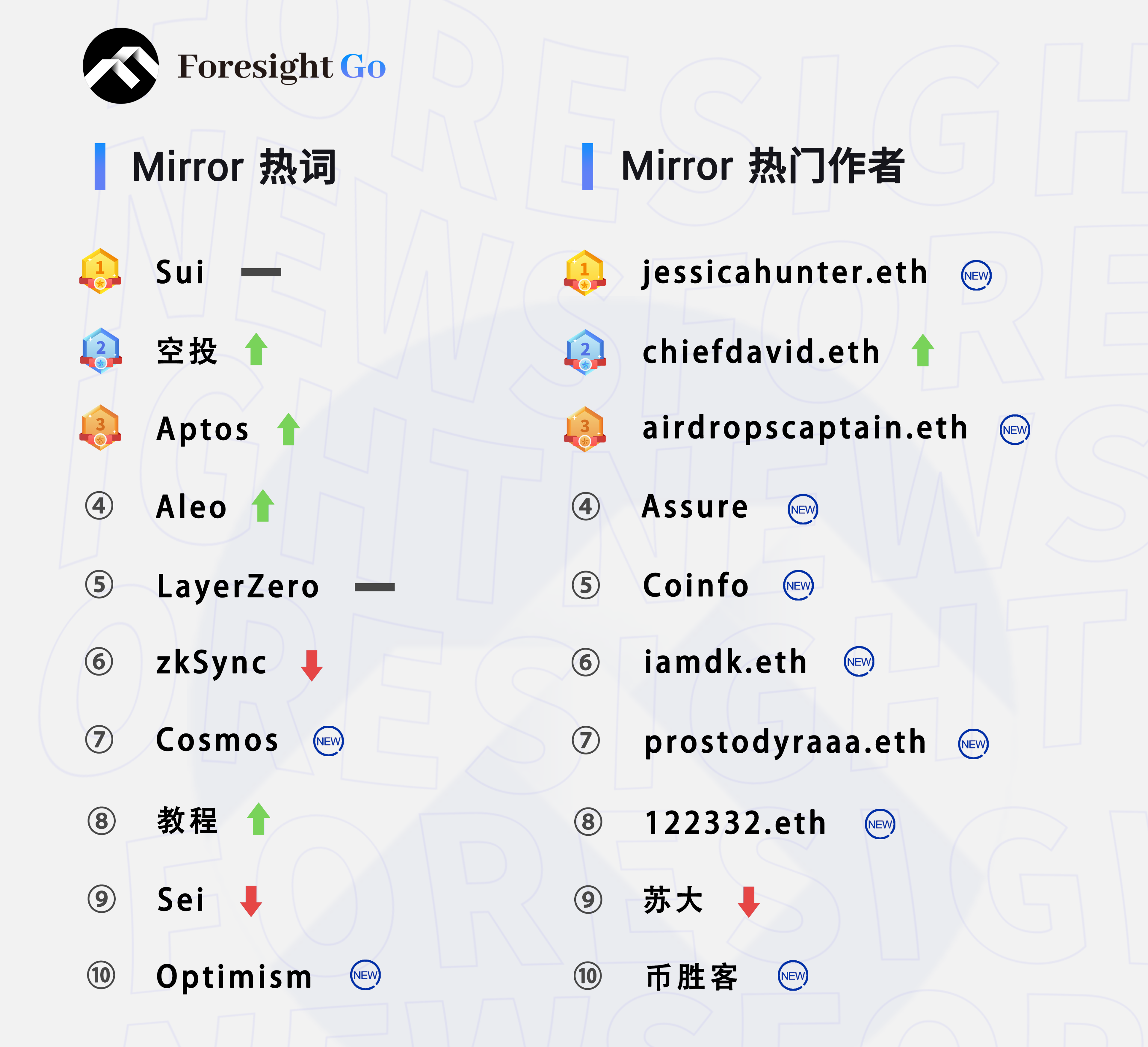 Mirror 热词排行榜继上周的固定排位规律被打破后,本周延续了这一趋势,「空投」、「教程」等不再霸榜前排,排名居前的「Aleo」等继续与站内的热搜榜紧密联动。
