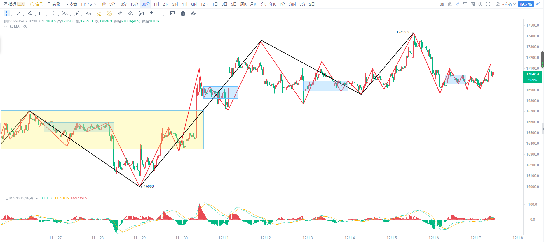 三十分钟走势来看,多空震荡并未让多头迅速逃离。本周内能突破17265则以为区间套走势上涨未结束。上升楔形或平台型特征继续有效。