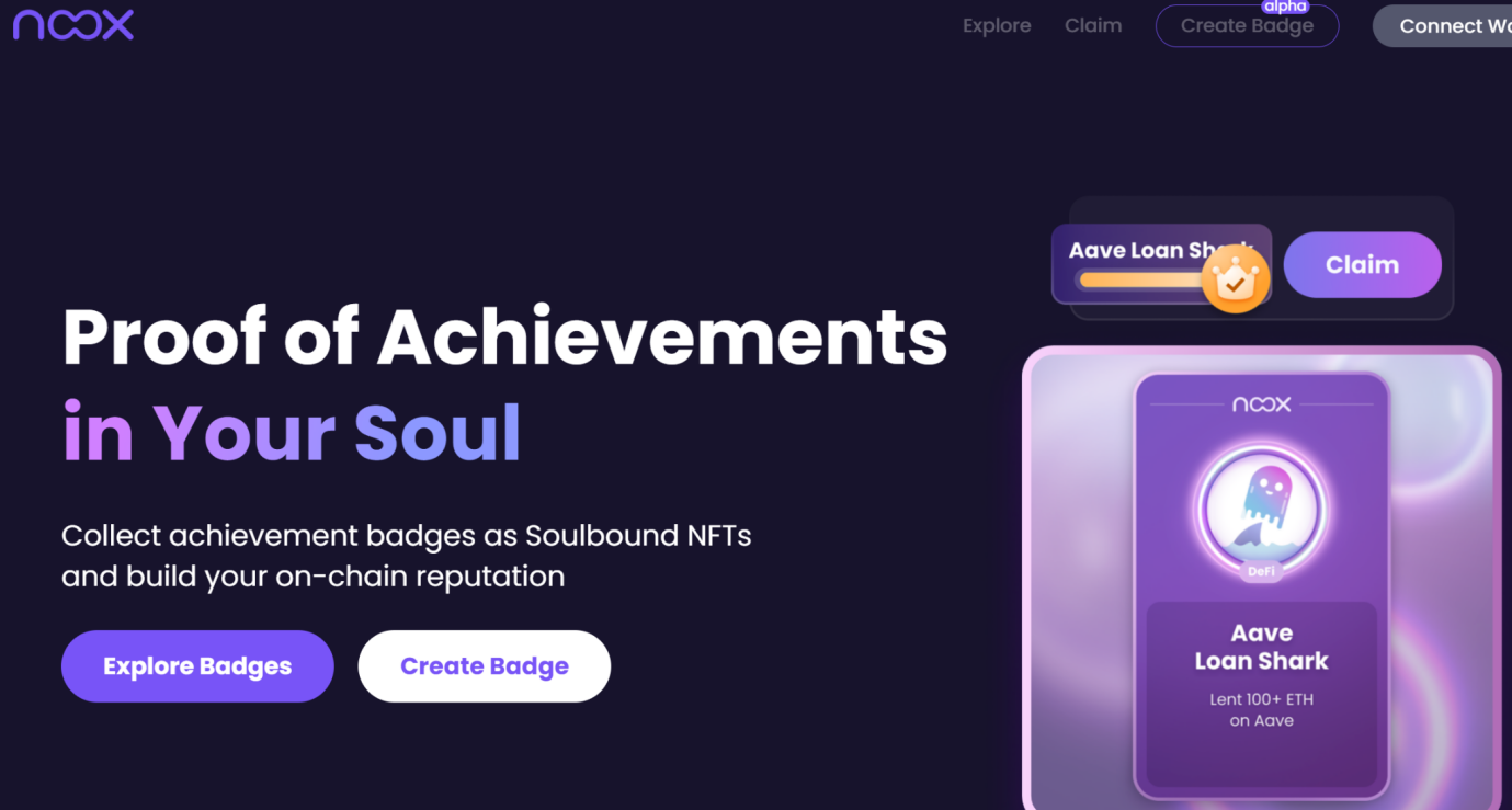 Noox 是一个供Web3用户基于链上行为铸造徽章来证明成就的平台。应用程序或者社区策划者可以在徽章中编入任意规则,例如交互数量,金额等,用户通过Noox平台发现相关活动后,可以进行钱包链接,在符合条件的情况下进行铸造。