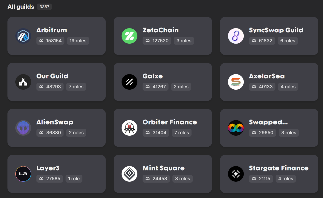Guild是一个基于DID的门控类应用。通过Guid平台,可以设置Discord或者Telegram的进入条件,比如持有哪些token,哪些NFT等。目前已经有基于众多项目的3000多个门控任务,知名的Layer2 Arbitrum的最新角色任务就是通过此平台进行。