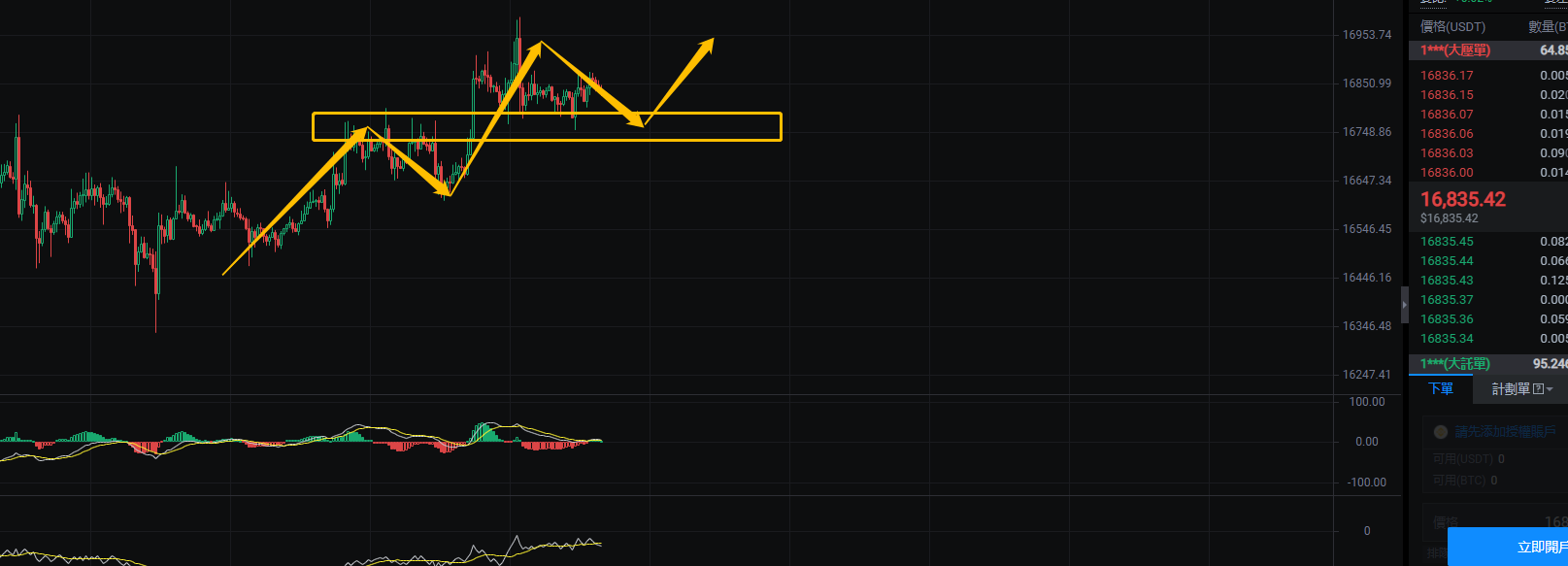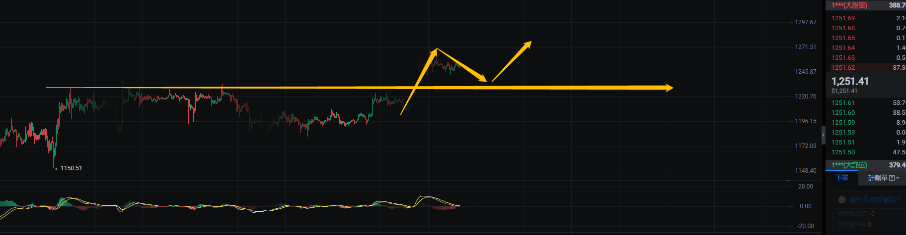 姨太的1H的结构,姨太只要不跌破下面黄色支撑那么就有继续上升的动力,整体的表现姨太还是强于大饼许多,姨太目前回踩的话也是三买的机会,所以姨太的机会可能高于大饼许多,当然现在个人还是建议慢慢买入现货为主,只要控制好仓位即可。