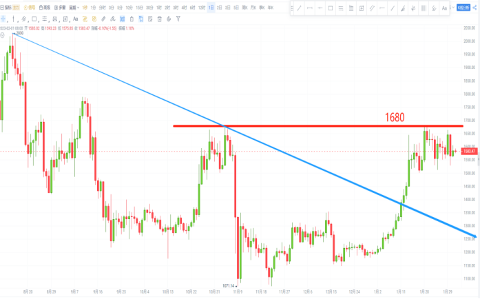 1、日线:以太坊自2030高点以来的下跌趋势未变,短期价格大幅上涨后正在测试1680一线位置,后期关注其测试结果。