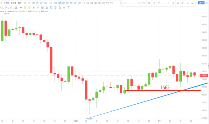 后期走势小幅回调未下破1520一线支撑便再次拉升,最高抵达1605一线。
