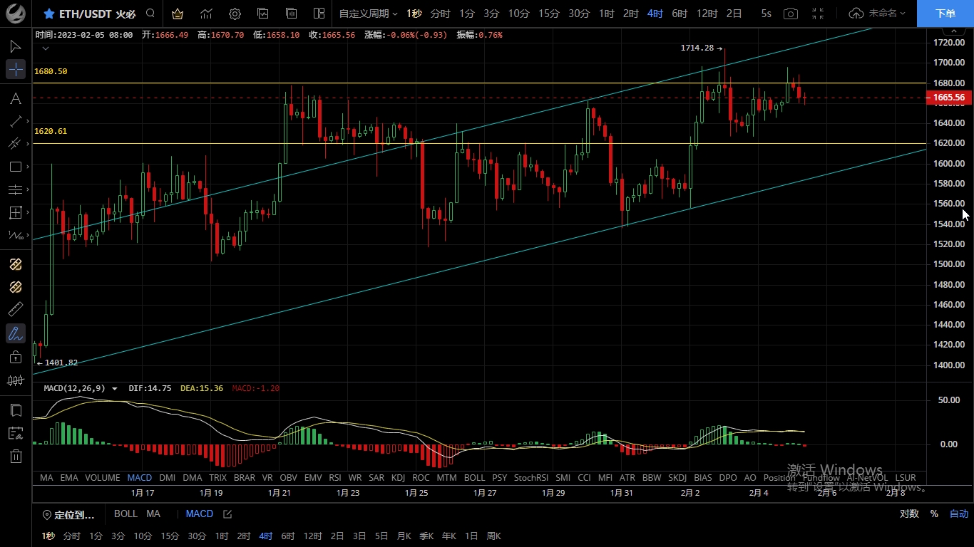 以太坊整体比大饼强势,白盘波动不大,晚间连阳上行最高触及1695一线承压回落,恭喜跟上昨日思路的朋友获利30点,目前币价在1661附近运行,四小时级别从盘面来看行情实体一直未突破1680,前天的文中提过未有效突破1680可逢高做空也反复吃了几波,上方承压明显k线连阴回落,短期受ma14支撑,以太坊结构虽强但1680不有效突破依旧会走回踩,切勿盲目追多,短期来看区间暂时不会被打破,思路上和昨日一致高空低多做短线,上方压制1680-1720,下方支撑1640-1620