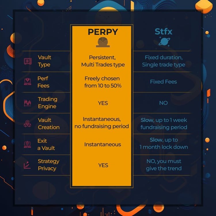 Perpy Finance 在概念上与 STFX 相似,但在设置上有所不同。根据 Perpy 的说法,主要区别在于 Perpy Vault 是连续的,收取可变费用,没有筹款期,并保护隐私。