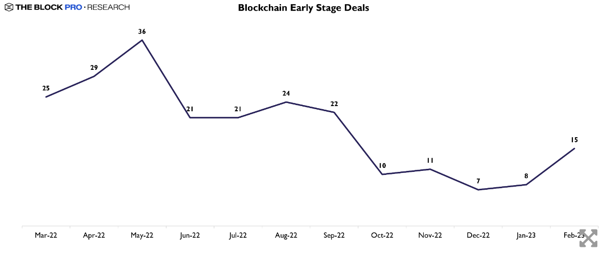 Last month, early stages deals such as FashionX's Series A showed an uptick since a sharp decline last October. The number of early-stage deals doubled from last month's eight to 15 in February, per The Block Research. Still, in terms of dollar amount, the average size of such deals declined.